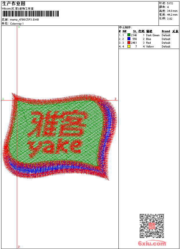 - emb花版参数: 大小:29.50 KB / 尺寸:44*34[毫米] / 针数:5172针 / 线色:4 / 格式:emb / 版本:9
