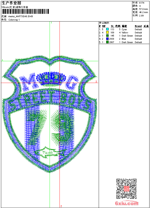 - emb花版参数: 大小:61.50 KB / 尺寸:46*57[毫米] / 针数:6174针 / 线色:4 / 格式:emb / 版本:9