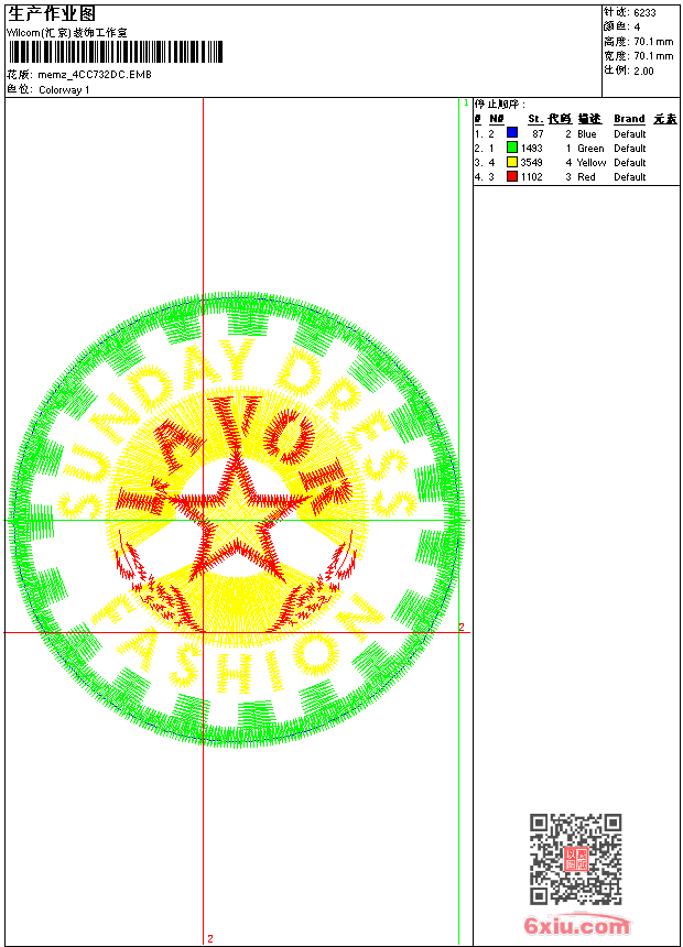 - emb花版参数: 大小:54.50 KB / 尺寸:70*70[毫米] / 针数:6233针 / 线色:4 / 格式:emb / 版本:9