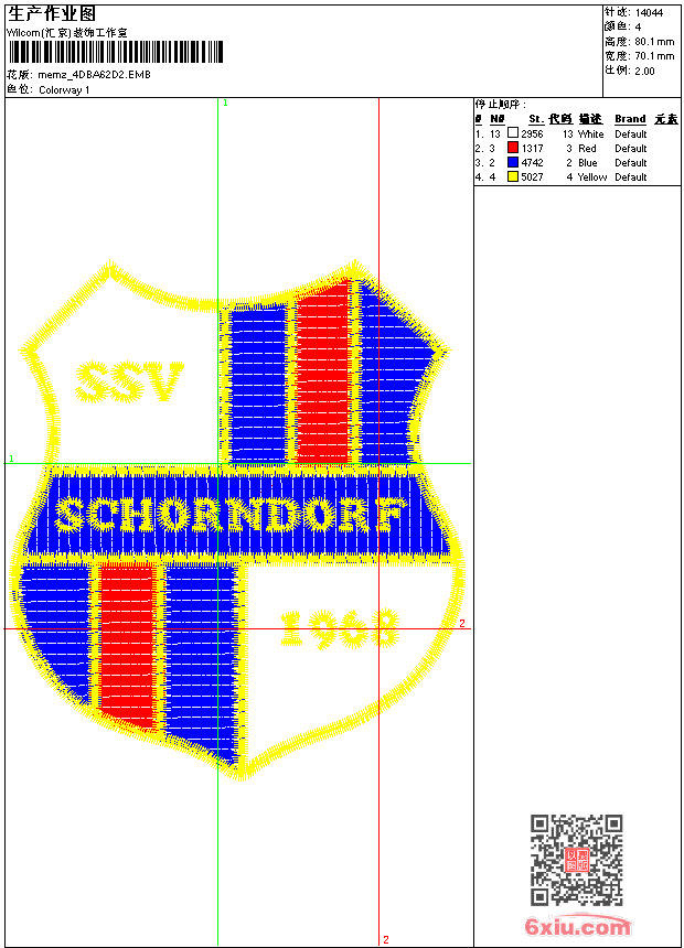 - emb花版参数: 大小:50.00 KB / 尺寸:70*80[毫米] / 针数:14044针 / 线色:4 / 格式:emb / 版本:9