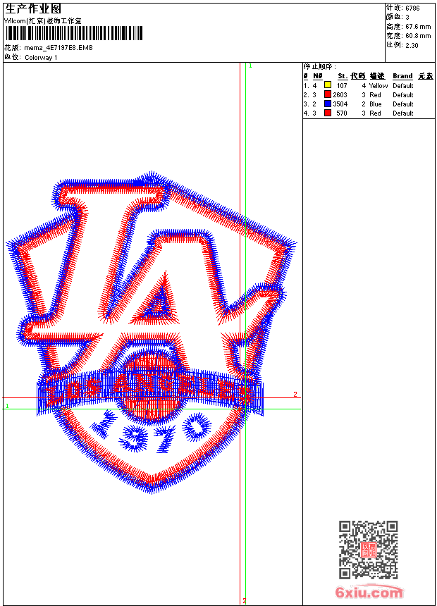 - emb花版参数: 大小:56.50 KB / 尺寸:61*68[毫米] / 针数:6786针 / 线色:3 / 格式:emb / 版本:9
