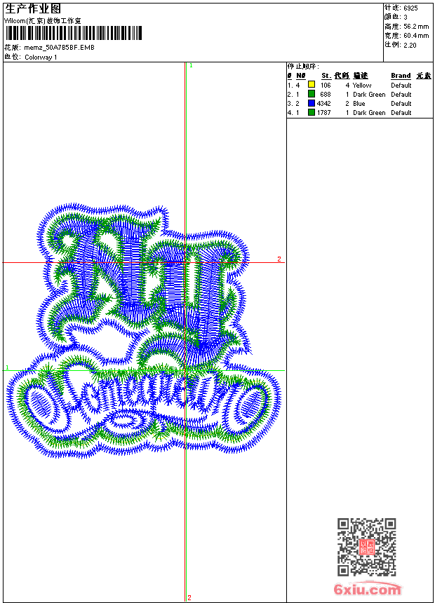 - emb花版参数: 大小:86.50 KB / 尺寸:60*56[毫米] / 针数:6925针 / 线色:3 / 格式:emb / 版本:9