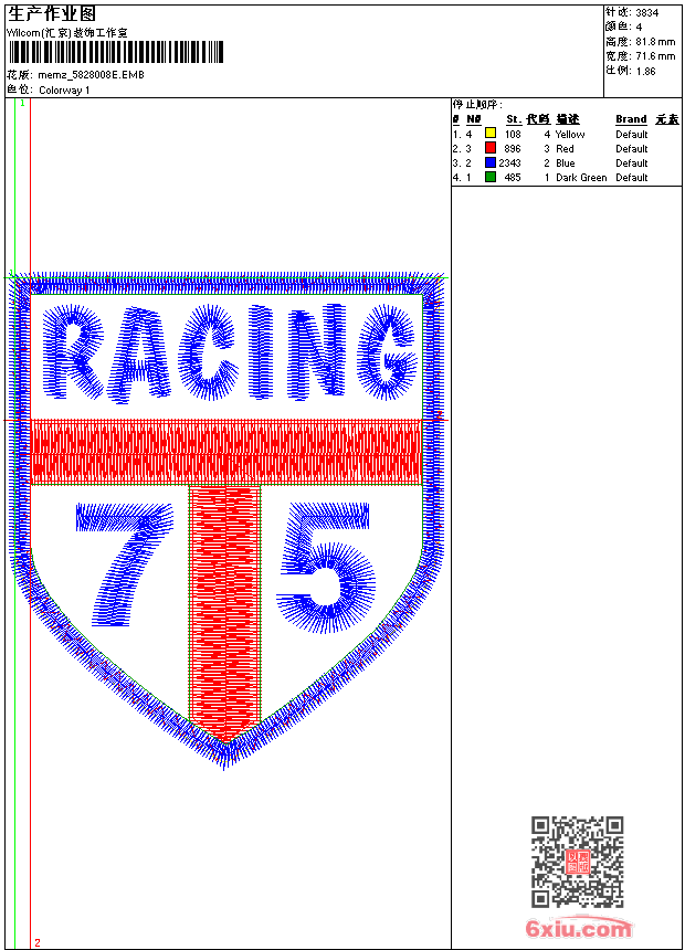 - emb花版参数: 大小:32.00 KB / 尺寸:72*82[毫米] / 针数:3834针 / 线色:4 / 格式:emb / 版本:9