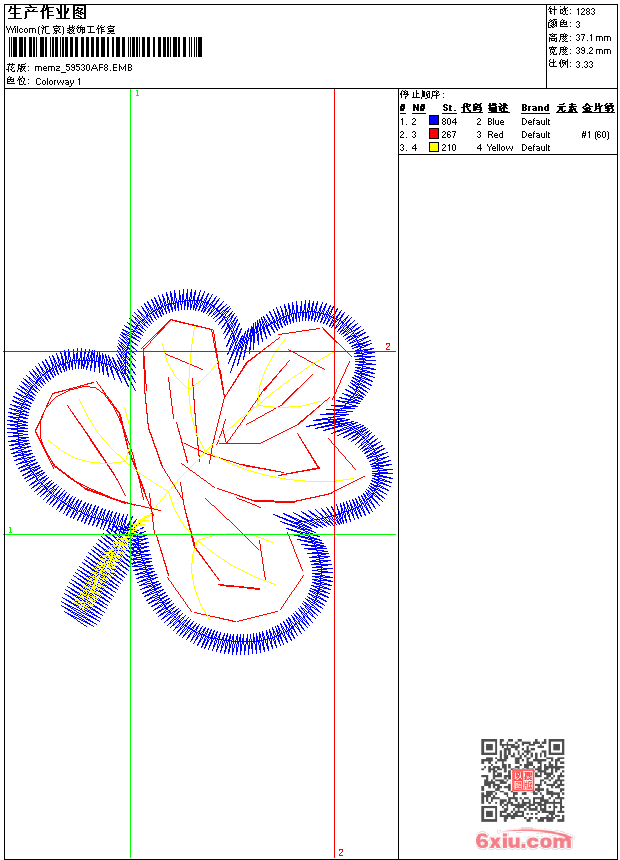 - emb花版参数: 大小:34.50 KB / 尺寸:39*37[毫米] / 针数:1283针 / 线色:3 / 格式:emb / 版本:9