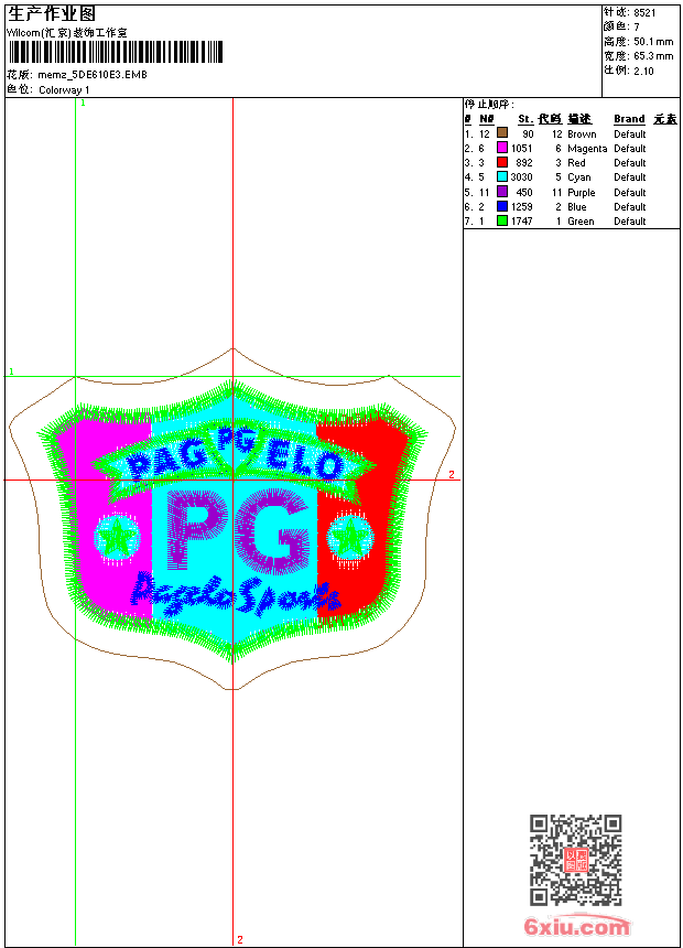 - emb花版参数: 大小:896.50 KB / 尺寸:65*50[毫米] / 针数:8521针 / 线色:7 / 格式:emb / 版本:9