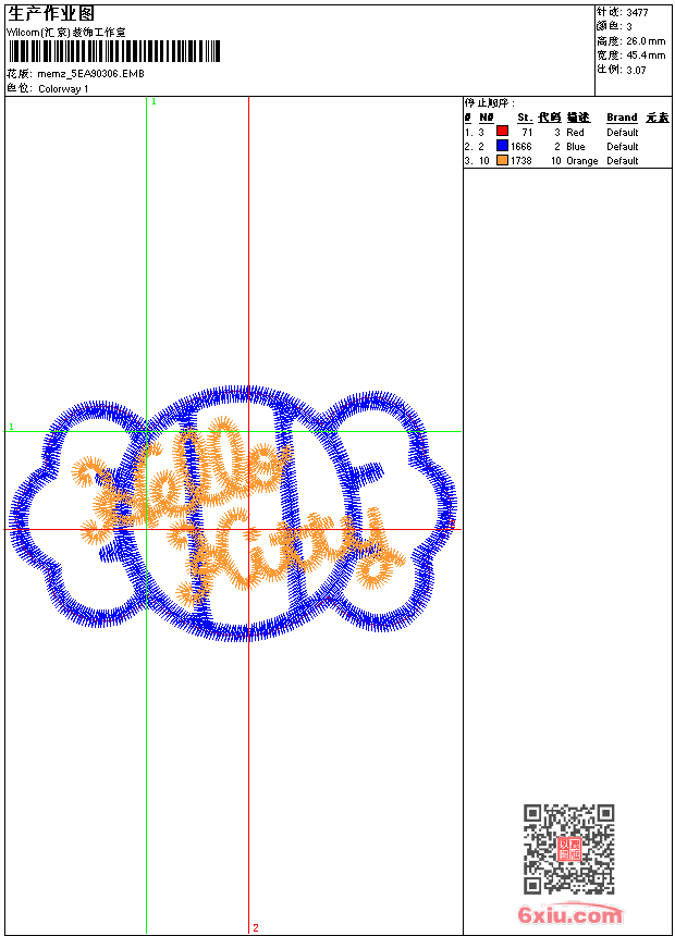 - emb花版参数: 大小:41.00 KB / 尺寸:45*26[毫米] / 针数:3477针 / 线色:3 / 格式:emb / 版本:9
