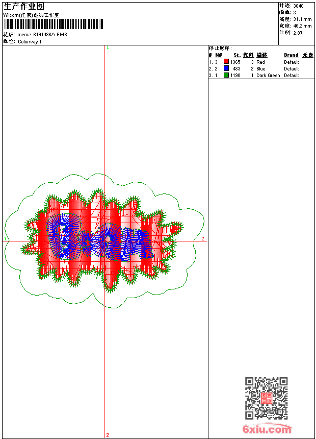 - emb花版参数: 大小:49.50 KB / 尺寸:46*31[毫米] / 针数:3039针 / 线色:3 / 格式:emb / 版本:9