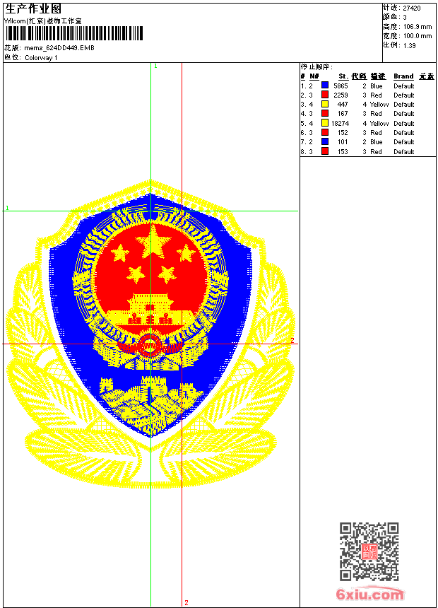 - emb花版参数: 大小:133.00 KB / 尺寸:100*107[毫米] / 针数:27420针 / 线色:3 / 格式:emb / 版本:9