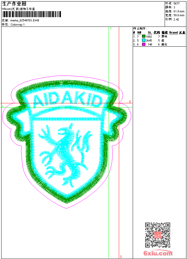 - emb花版参数: 大小:43.00 KB / 尺寸:60*62[毫米] / 针数:5677针 / 线色:3 / 格式:emb / 版本:9