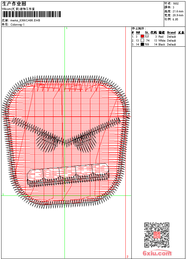 - emb花版参数: 大小:24.50 KB / 尺寸:21*22[毫米] / 针数:1602针 / 线色:3 / 格式:emb / 版本:9