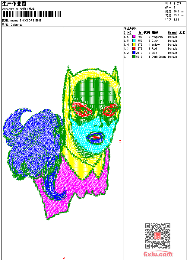 - emb花版参数: 大小:406.00 KB / 尺寸:69*90[毫米] / 针数:11577针 / 线色:6 / 格式:emb / 版本:9