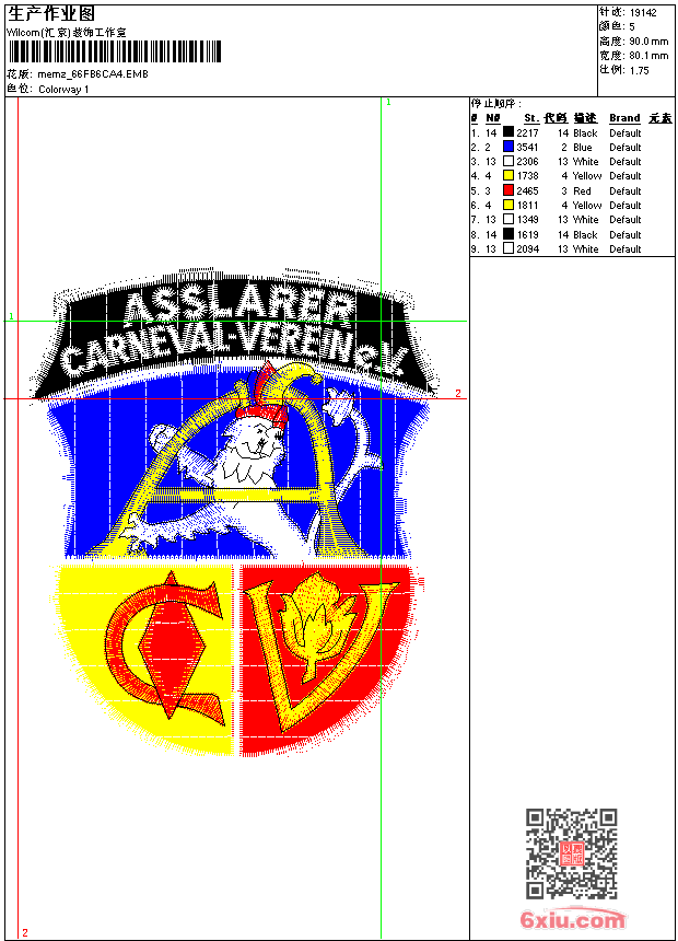 - emb花版参数: 大小:93.00 KB / 尺寸:80*90[毫米] / 针数:19142针 / 线色:5 / 格式:emb / 版本:9