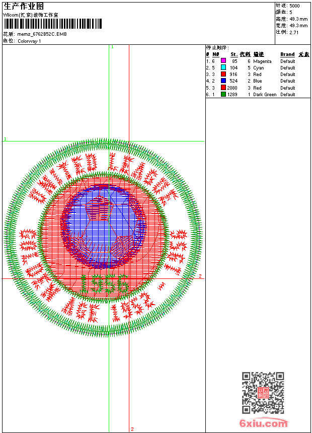 - emb花版参数: 大小:55.00 KB / 尺寸:49*49[毫米] / 针数:5000针 / 线色:5 / 格式:emb / 版本:9