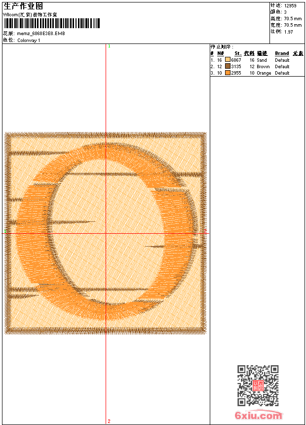 - emb花版参数: 大小:432.00 KB / 尺寸:71*70[毫米] / 针数:12961针 / 线色:3 / 格式:emb / 版本:9