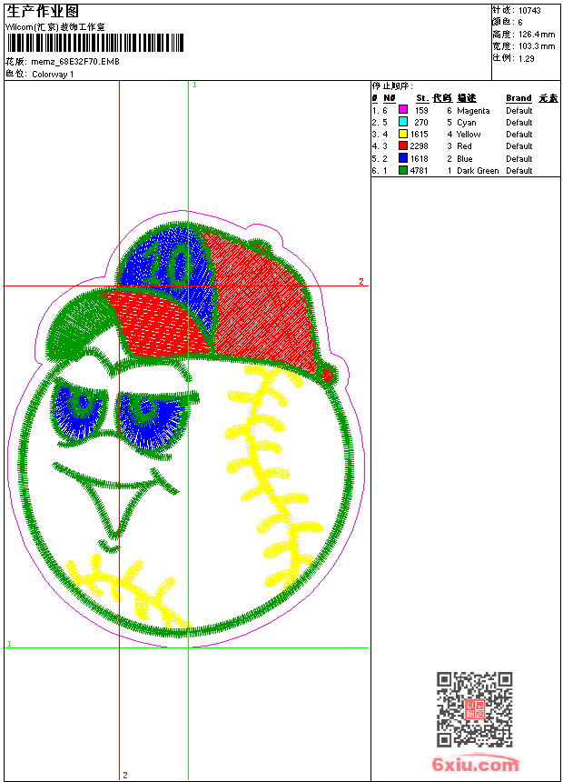 - emb花版参数: 大小:74.50 KB / 尺寸:103*126[毫米] / 针数:10743针 / 线色:6 / 格式:emb / 版本:9