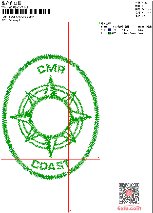 - emb花版参数: 大小:47.00 KB / 尺寸:63*80[毫米] / 针数:4726针 / 线色:2 / 格式:emb / 版本:9
