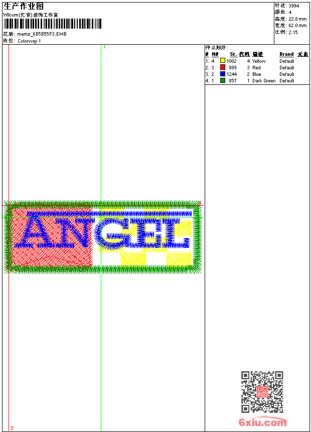 - emb花版参数: 大小:27.50 KB / 尺寸:62*23[毫米] / 针数:3994针 / 线色:4 / 格式:emb / 版本:9