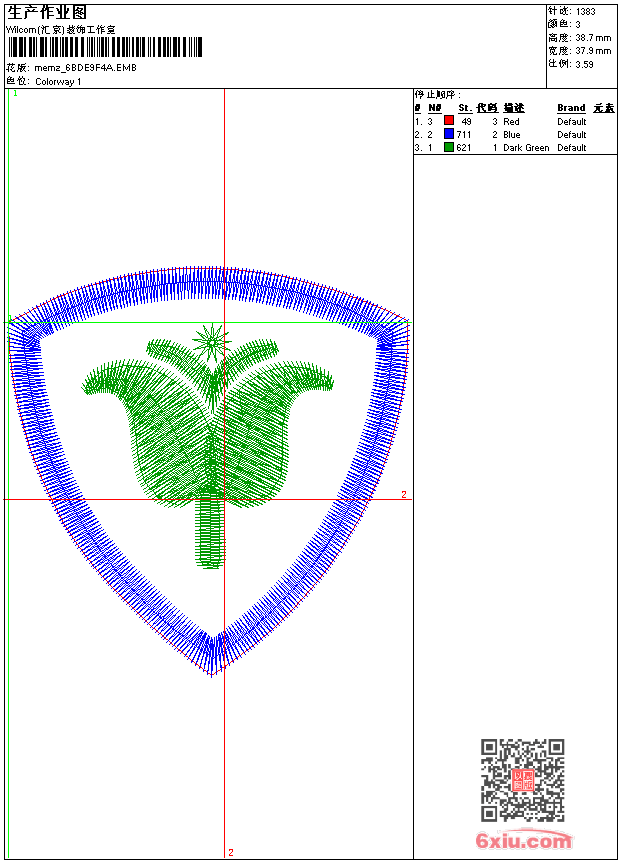 - emb花版参数: 大小:23.00 KB / 尺寸:38*39[毫米] / 针数:1383针 / 线色:3 / 格式:emb / 版本:9