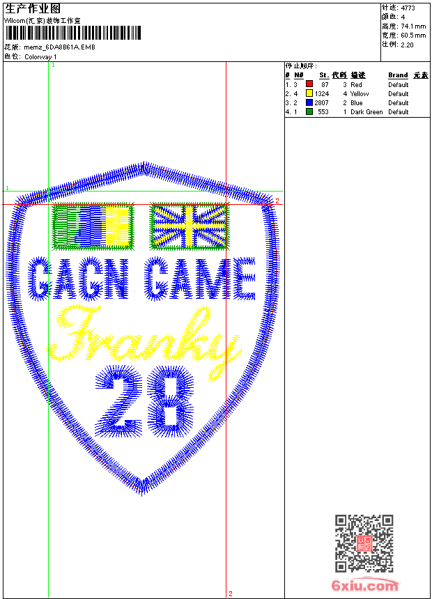 - emb花版参数: 大小:42.50 KB / 尺寸:61*74[毫米] / 针数:4773针 / 线色:4 / 格式:emb / 版本:9