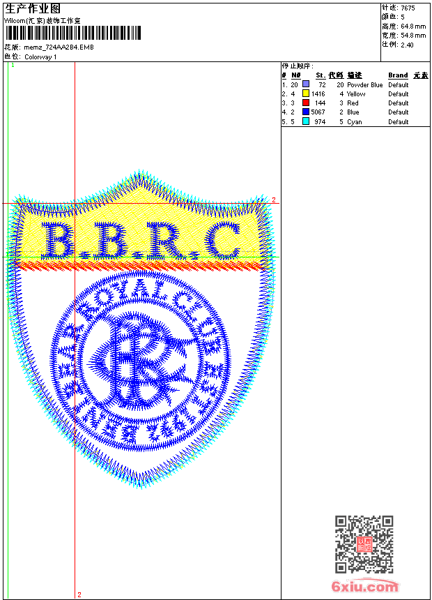 - emb花版参数: 大小:64.00 KB / 尺寸:55*65[毫米] / 针数:7675针 / 线色:5 / 格式:emb / 版本:9