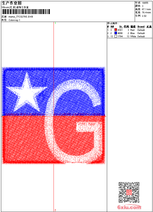 - emb花版参数: 大小:355.00 KB / 尺寸:70*67[毫米] / 针数:10057针 / 线色:3 / 格式:emb / 版本:9
