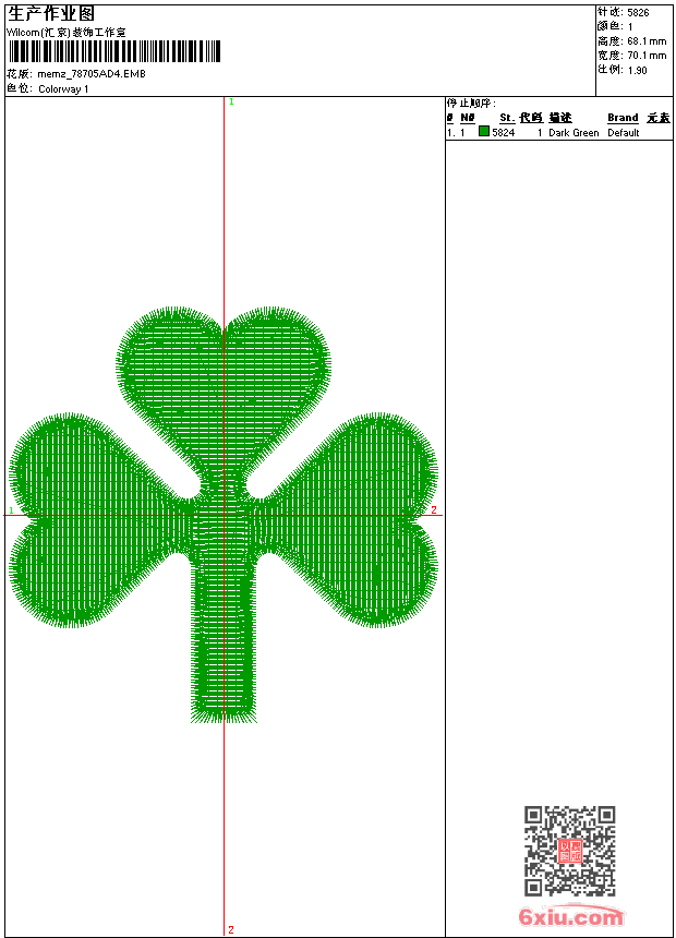 - emb花版参数: 大小:345.00 KB / 尺寸:70*68[毫米] / 针数:5828针 / 线色:1 / 格式:emb / 版本:9