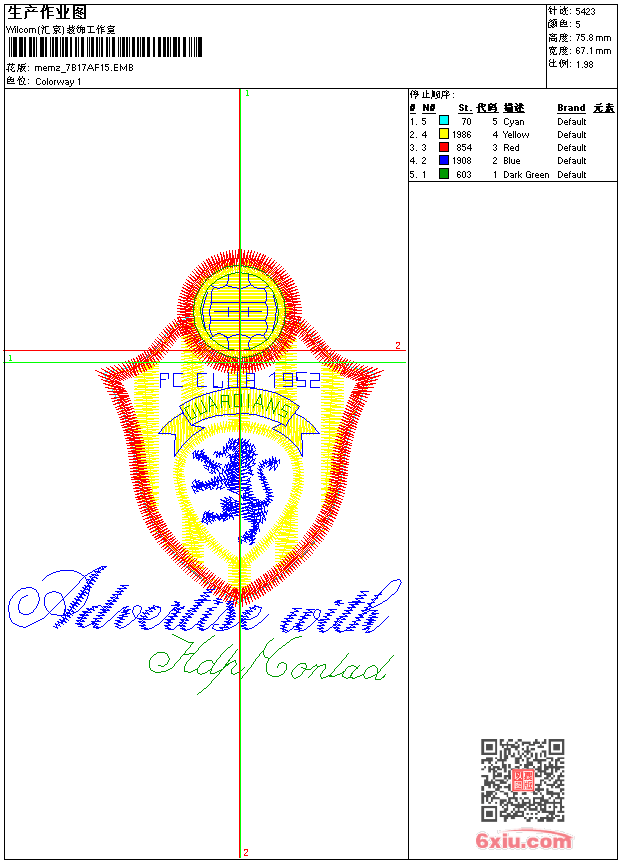 - emb花版参数: 大小:63.00 KB / 尺寸:67*76[毫米] / 针数:5423针 / 线色:5 / 格式:emb / 版本:9