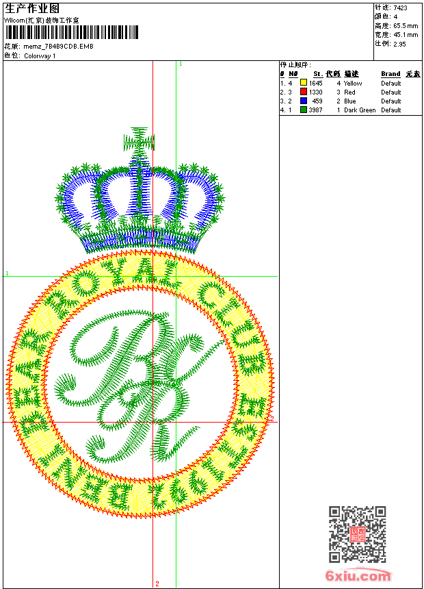 - emb花版参数: 大小:64.00 KB / 尺寸:45*65[毫米] / 针数:7423针 / 线色:4 / 格式:emb / 版本:9