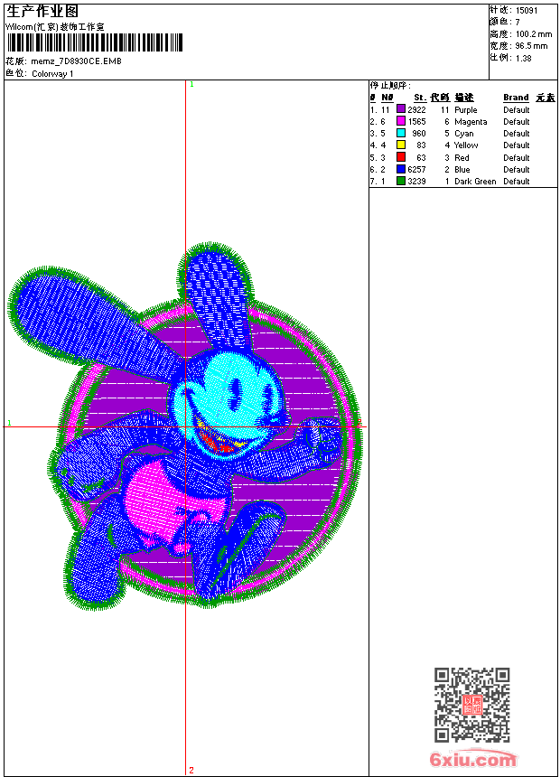 - emb花版参数: 大小:493.50 KB / 尺寸:97*100[毫米] / 针数:15091针 / 线色:7 / 格式:emb / 版本:9