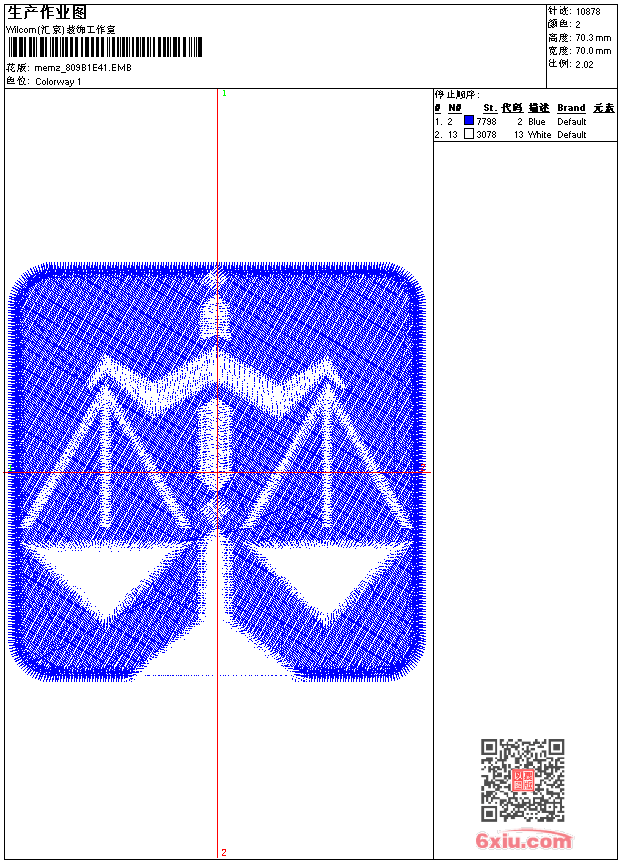 - emb花版参数: 大小:505.00 KB / 尺寸:70*70[毫米] / 针数:10880针 / 线色:2 / 格式:emb / 版本:9