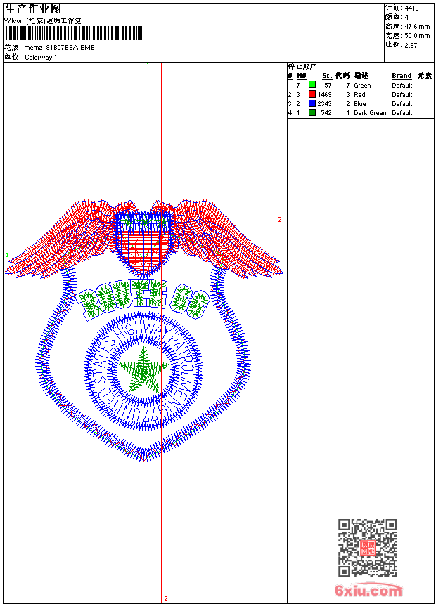 - emb花版参数: 大小:61.50 KB / 尺寸:50*48[毫米] / 针数:4413针 / 线色:4 / 格式:emb / 版本:9
