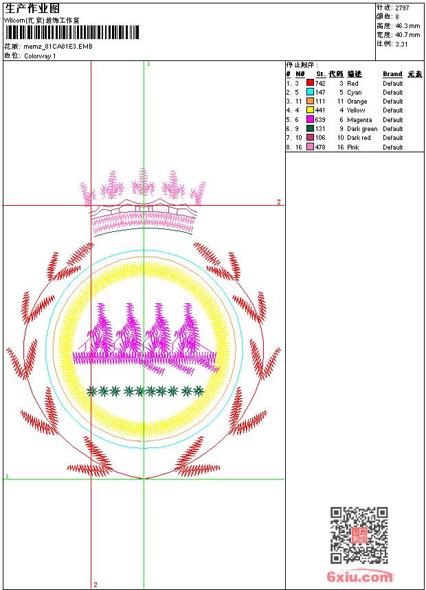 - emb花版参数: 大小:142.00 KB / 尺寸:41*46[毫米] / 针数:2797针 / 线色:8 / 格式:emb / 版本:9