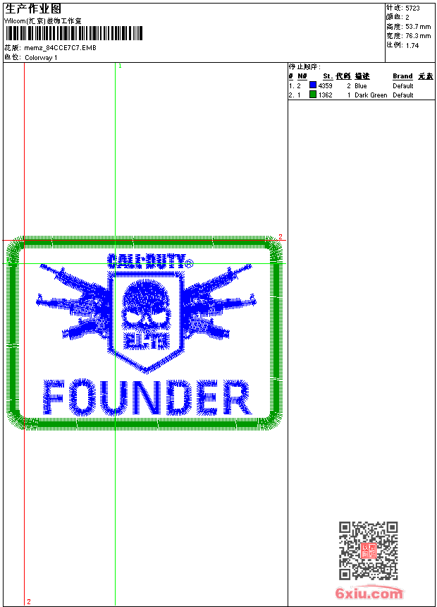- emb花版参数: 大小:41.50 KB / 尺寸:76*54[毫米] / 针数:5723针 / 线色:2 / 格式:emb / 版本:9