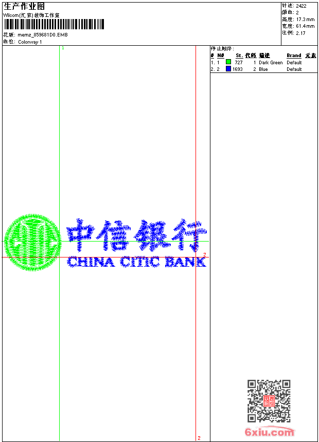 - emb花版参数: 大小:33.50 KB / 尺寸:61*17[毫米] / 针数:2422针 / 线色:2 / 格式:emb / 版本:9