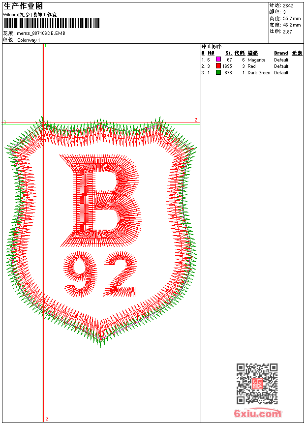 - emb花版参数: 大小:31.50 KB / 尺寸:46*56[毫米] / 针数:2642针 / 线色:3 / 格式:emb / 版本:9
