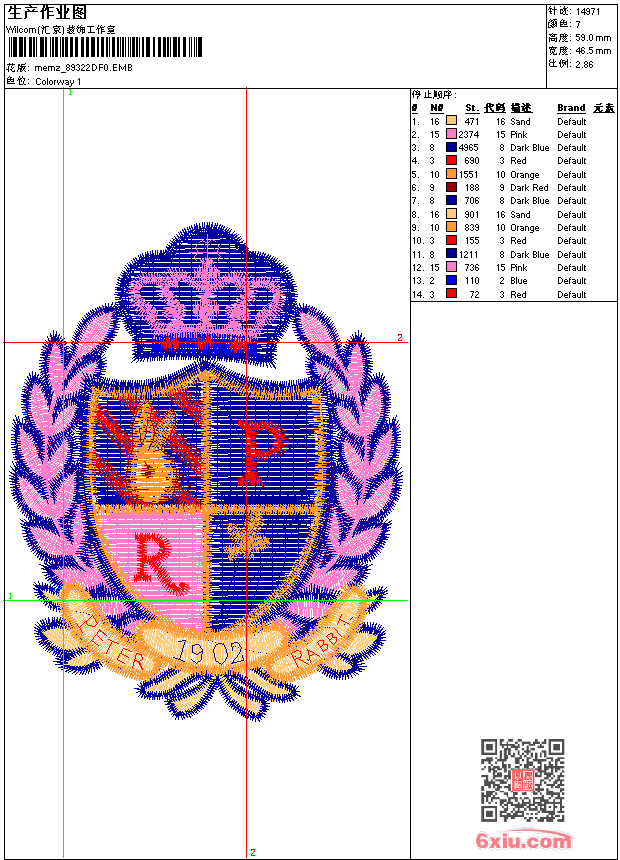 - emb花版参数: 大小:111.00 KB / 尺寸:47*59[毫米] / 针数:14971针 / 线色:7 / 格式:emb / 版本:9