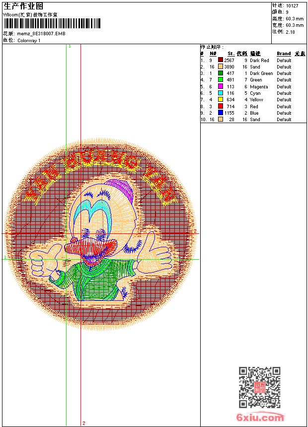 - emb花版参数: 大小:82.50 KB / 尺寸:60*60[毫米] / 针数:10127针 / 线色:9 / 格式:emb / 版本:9