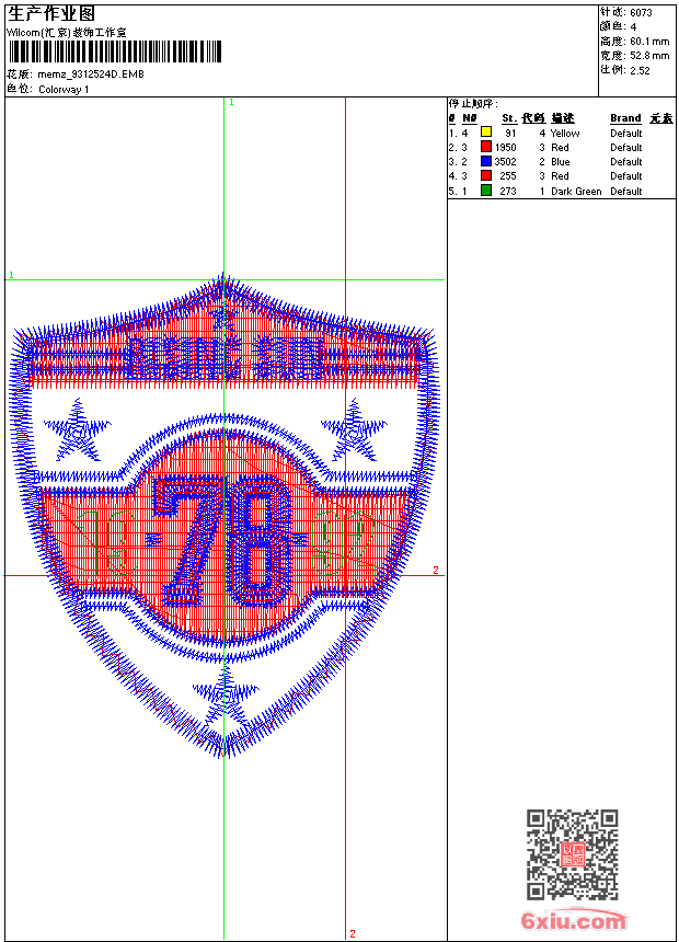 - emb花版参数: 大小:47.00 KB / 尺寸:53*60[毫米] / 针数:6073针 / 线色:4 / 格式:emb / 版本:9