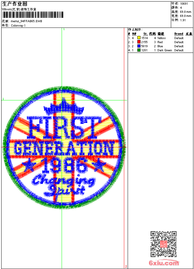 - emb花版参数: 大小:58.00 KB / 尺寸:70*70[毫米] / 针数:10691针 / 线色:4 / 格式:emb / 版本:9