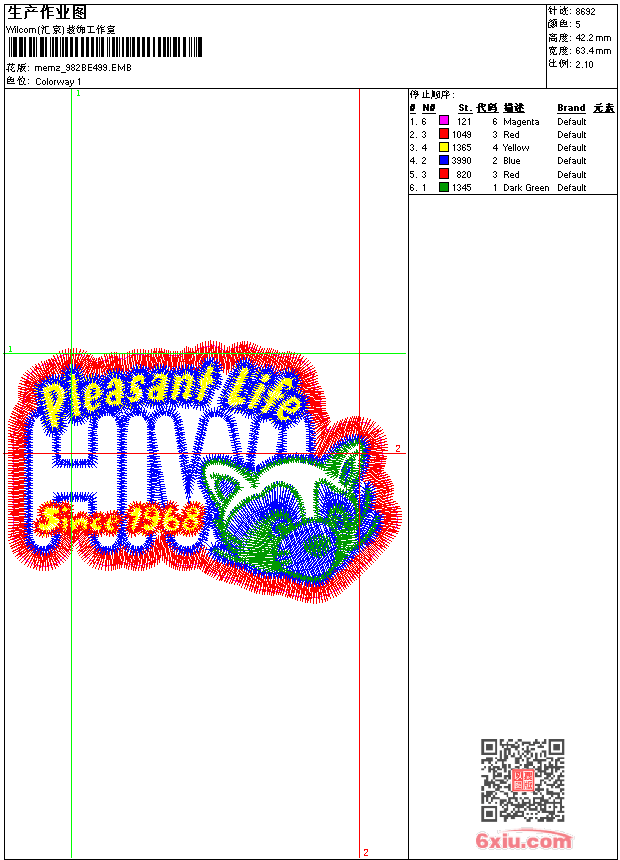 - emb花版参数: 大小:98.50 KB / 尺寸:63*42[毫米] / 针数:8692针 / 线色:5 / 格式:emb / 版本:9