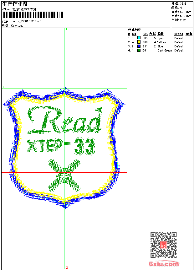 - emb花版参数: 大小:41.50 KB / 尺寸:60*60[毫米] / 针数:3239针 / 线色:4 / 格式:emb / 版本:9