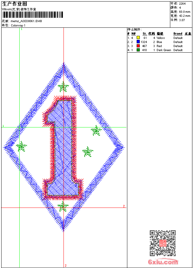 - emb花版参数: 大小:25.50 KB / 尺寸:43*60[毫米] / 针数:2264针 / 线色:4 / 格式:emb / 版本:9