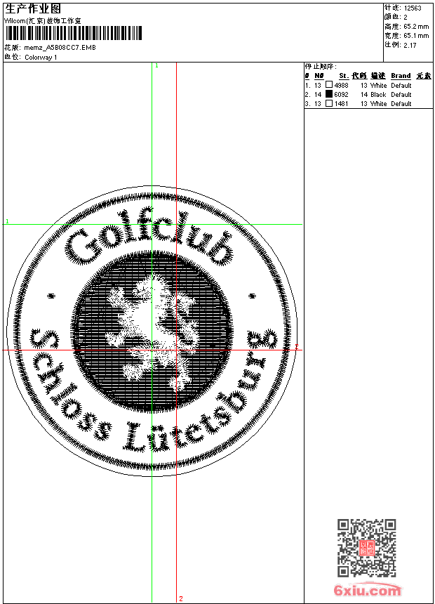 - emb花版参数: 大小:79.00 KB / 尺寸:65*65[毫米] / 针数:12563针 / 线色:2 / 格式:emb / 版本:9