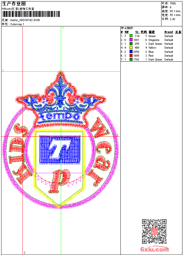 - emb花版参数: 大小:77.00 KB / 尺寸:55*65[毫米] / 针数:7586针 / 线色:6 / 格式:emb / 版本:9