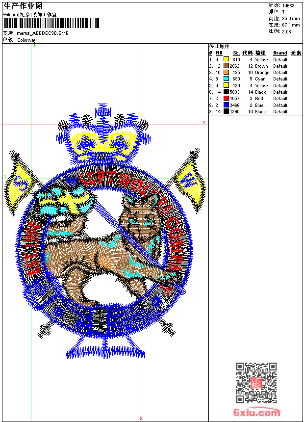 - emb花版参数: 大小:304.00 KB / 尺寸:67*85[毫米] / 针数:14669针 / 线色:7 / 格式:emb / 版本:9