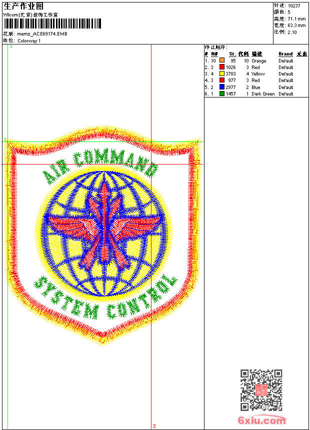 - emb花版参数: 大小:79.50 KB / 尺寸:63*71[毫米] / 针数:10237针 / 线色:5 / 格式:emb / 版本:9