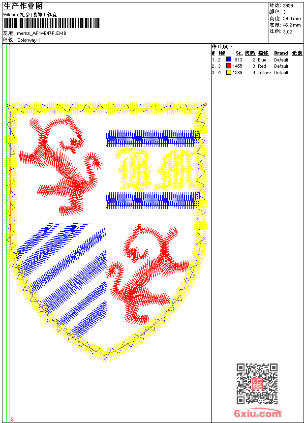 - emb花版参数: 大小:39.50 KB / 尺寸:46*59[毫米] / 针数:3959针 / 线色:3 / 格式:emb / 版本:9