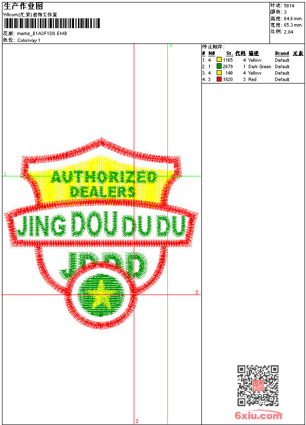 - emb花版参数: 大小:45.50 KB / 尺寸:65*65[毫米] / 针数:5814针 / 线色:3 / 格式:emb / 版本:9