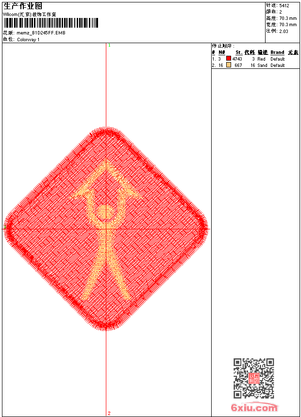 - emb花版参数: 大小:302.00 KB / 尺寸:70*70[毫米] / 针数:5414针 / 线色:2 / 格式:emb / 版本:9