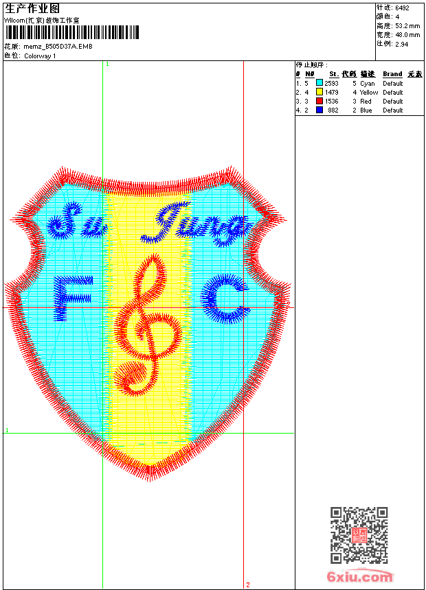 - emb花版参数: 大小:36.50 KB / 尺寸:48*53[毫米] / 针数:6492针 / 线色:4 / 格式:emb / 版本:9